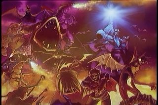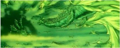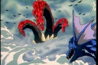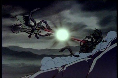 Раградия (справа) и её драконы против Шабранигдо (тень слева) и Гаава