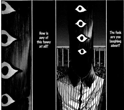 Нет, это не грибы ради грибов. Это очень интересный ход, на самом деле — показать ту же историю традиционными методами, и было бы совсем не то; потому что это фактически довольно типичная история про няшного ребенка, в силу различных жизненных обстоятельств вырастающего в говно и скатывающего в говно свою жизнь, и наблюдать за этим процессом со стороны, прямо скажем, удовольствия мало. Но здесь мы не наблюдаем со стороны. Весь этот сюр служит одной цели — показать этот процесс изнутри, из головы главгероя, со всей живущей в ней пиздецомой. И результат ударяет по мозгам только так. Читать это реально психологически тяжело, но все равно стоит — манга уникальная в своем роде.