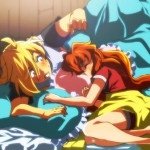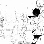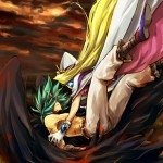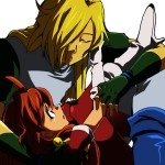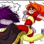 Лина ногой набивает морду Зелосу. Хотя у самой Лины морда оставляет желать лучшего ^^