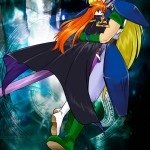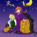 Картинка на Хеллоуин. На этот раз Лина изображена вампиром. Гаури оборотень, а Амелия – ведьма, тащит за собой привязанного к метле неко-Зелгадиса.